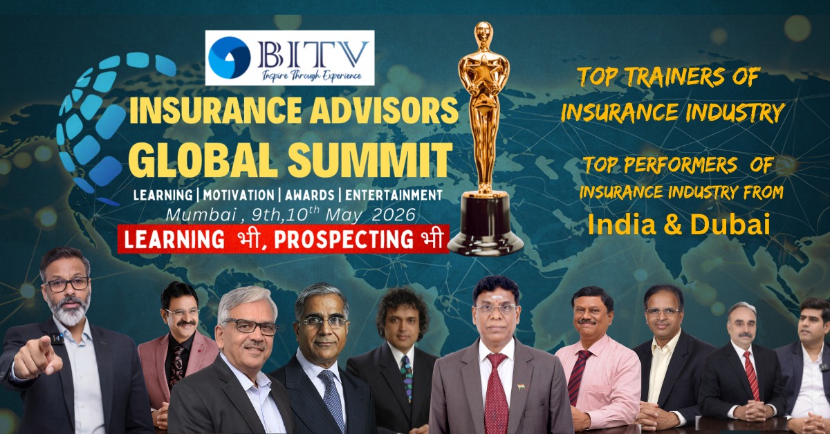 BITV GLOBAL SUMMIT 2026 For insurance advisors LEARNING PROSPECTING AWARDS Mumbai, 9th & 10th may 2026 Hotel Club Emerald, Swastik Park, Chembur, Mumbai, Maharashtra 400071 Click Here to Register 💻 ONLINE ACCESS ₹1,099 ₹5,000 78% OFF 📦 PHYSICAL EVENT ₹15,000 ₹50,000 70% OFF PHYSICAL VERSION INCLUDES 🎥 FREE Interview Video at your home – Worth ₹30,000 🥈 You will receive a Silver Pin 🌟 Opportunity to become a Gold Member & Attend Global Summit FREE Register for the Insurance Advisors Global Summit and receive an exclusive benefit worth ₹30,000 from BITV. Click Here to Register Ranjit SinghHost & Creator BITV Shailesh JoshiMultiple TOT Advisor ( LIC ) Rajesh SatoskarMultiple TOT Advisor ( LIC ) Lazarus DiasInsurance Advisory Business Coach & Author Randhir BhallaInsurance Advisory Business Coach & Author R. Gopinath Insurance Industry Coach & Trainer Anoop KumarEX LIC Executive Director & Professional Speaker Harish AroraMultiple TOT Advisor ( LIC ) Rajeev RankaMultiple TOT Advisor ( LIC ) Ashok SardanaTop Insurance Advisor from Dubai What You Will Get: Professional Video at Your Home The BITV Team will visit your home and create a professional video featuring you and your family, Value: ₹30,000 Total Complimentary Benefits Worth ₹30,000 Limited to the First 100 Registration Click Here to Register Global Summit Schedule Date: Saturday, 9th May 2026 & Sunday, 10th May 2026 Venue: Mumbai, Chembur , Club Emerald Timings: 8:00 AM – 5:00 PM (followed by High Tea) Click Here to Register Daily Schedule (Same for Both Days) 08:00 AM – 09:00 AM Registration & Breakfast 09:00 AM – 11:00 AM Learning SessionsAwardsEntertainmentNetworking 11:00 AM – 11:30 AM Tea Break 11:30 AM – 01:30 PM Learning SessionsAwardsEntertainmentNetworking 01:30 PM – 02:30 PM Lunch Break 02:30 PM – 05:00 PM Learning SessionsAwardsEntertainmentNetworking 05:00 PM onwards High Tea & Informal Networking Book Your Seat Register Now Our Old Summits OUR TOP PROGRAMS